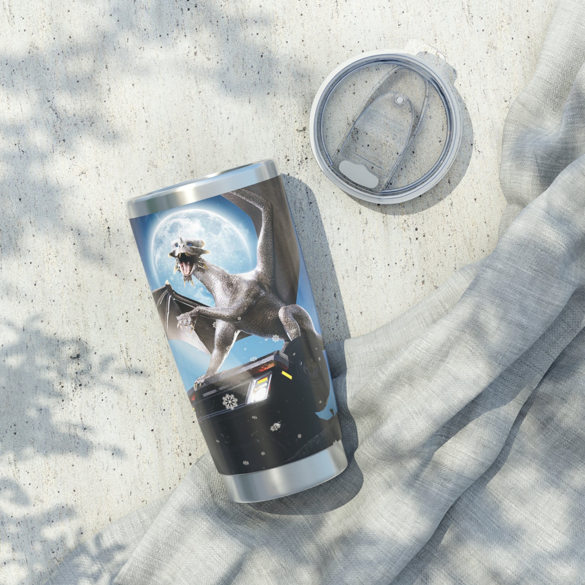Enjoy your drink of choice with this tumbler featuring this dragon on a car from the upcoming Queen of the Flightless Dragons series! This tumbler is the best companion on road trips – it fits perfectly into car cup holders. The rubber gasket makes it spill-resistant on bumpier roads, and the double-wall insulation makes sure drinks stay at the right temperature until the next pit stop.