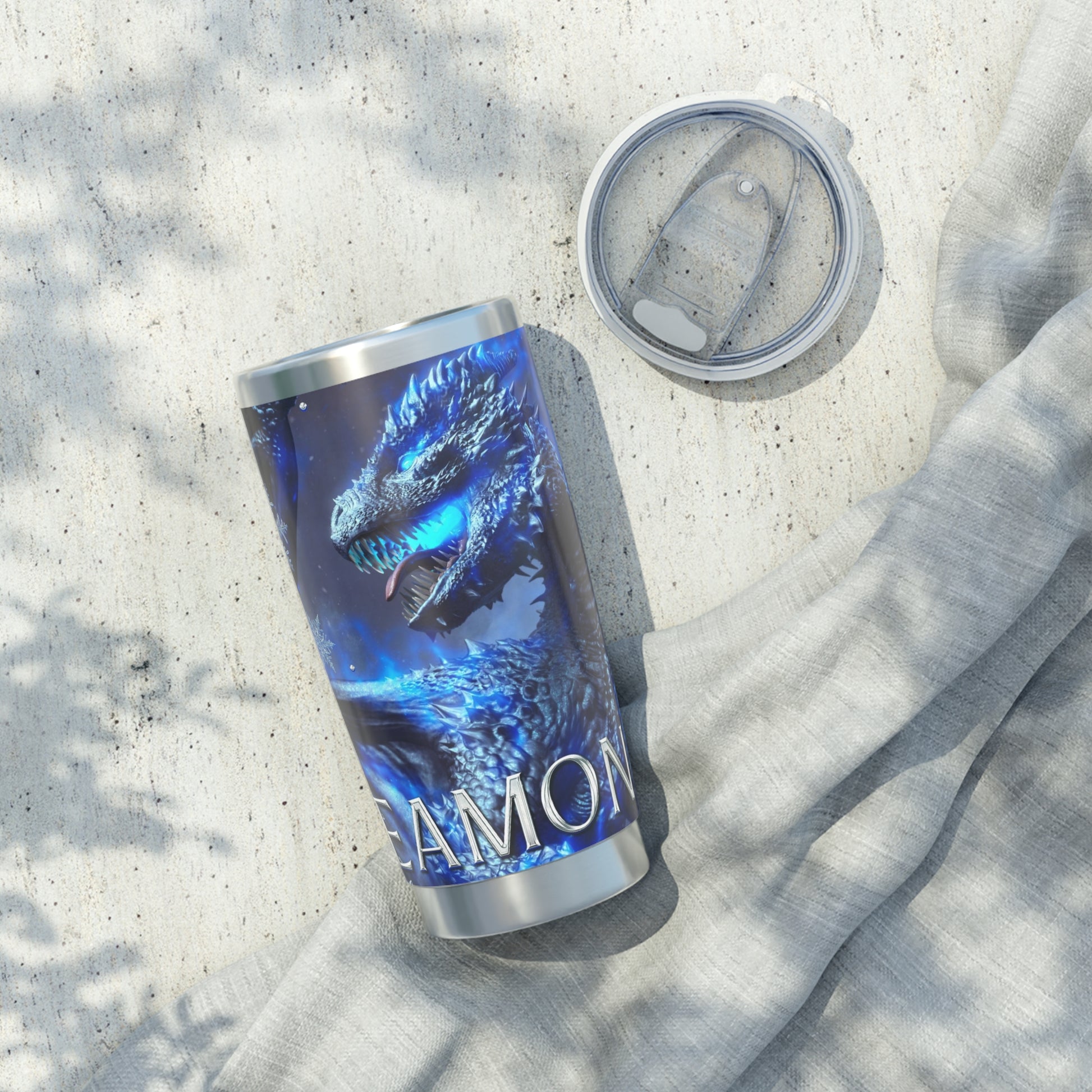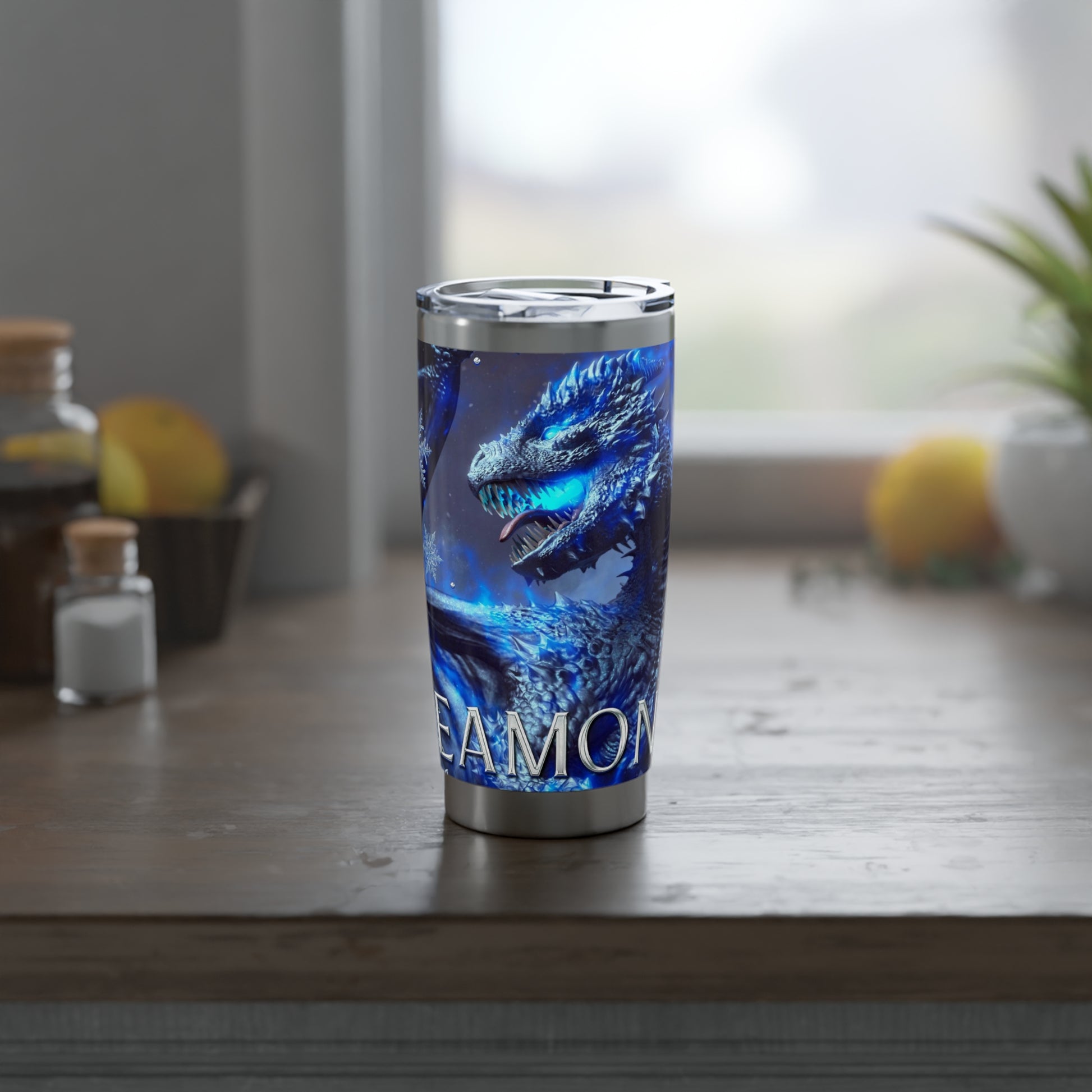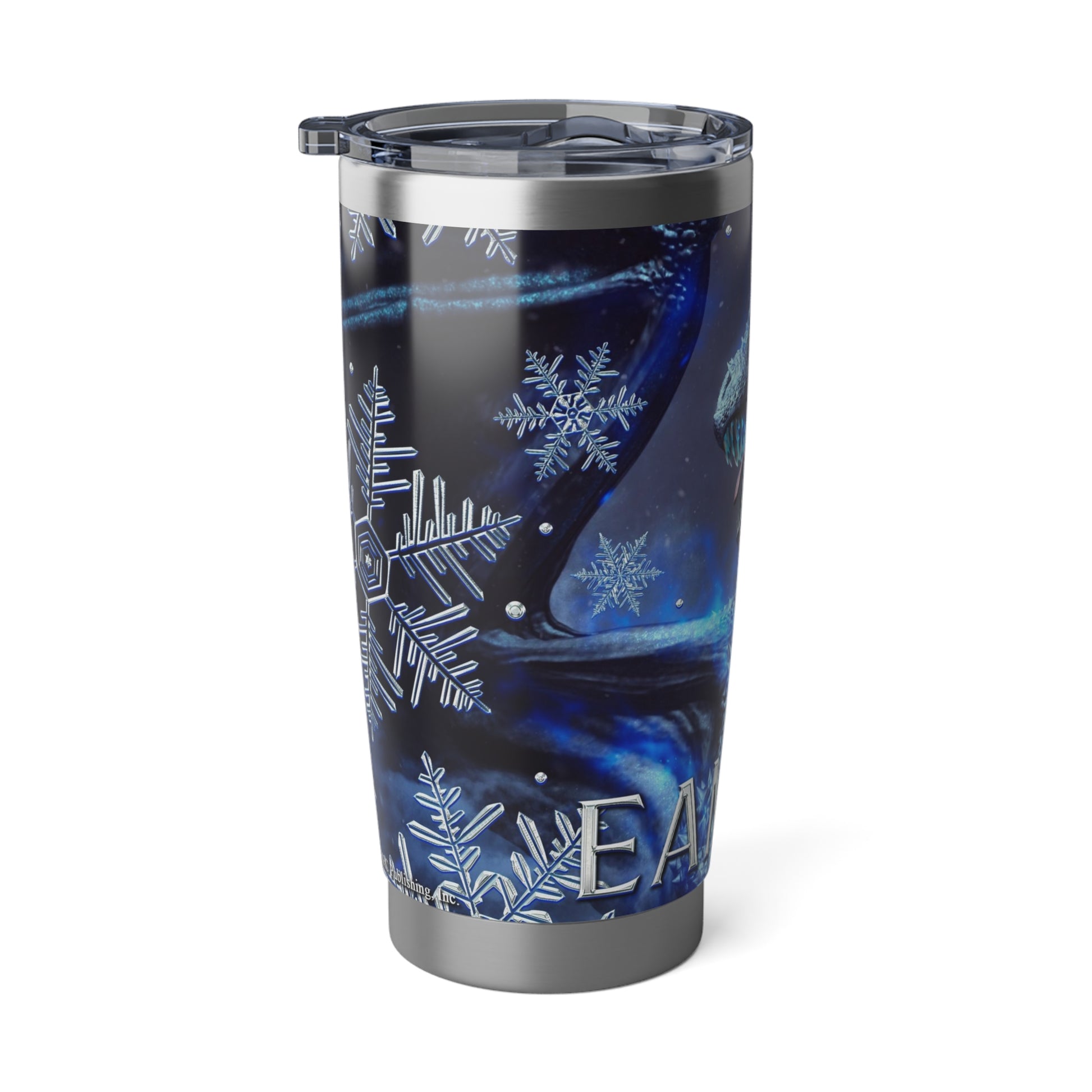 Enjoy a nice cup of coffee, tea, hot chocolate, or your drink of choice with this beautiful Eamon cover from the upcoming Queen of the Flightless Dragons series! This tumbler is the best companion on road trips – it fits perfectly into car cup holders. The rubber gasket makes it spill-resistant on bumpier roads, and the double-wall insulation makes sure drinks stay at the right temperature until the next pit stop.
